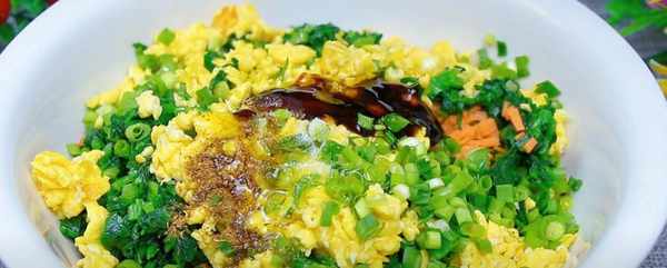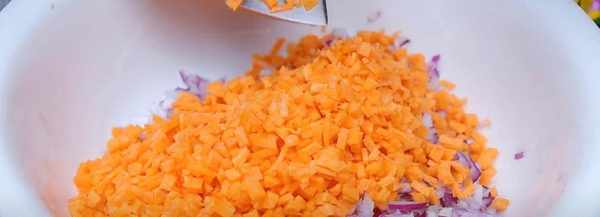 第四步。然后从馅料上切下配菜,将洋葱和胡萝卜切丁,准备切碎的小葱。将鸡蛋煎好,放入鸡蛋块中煎。