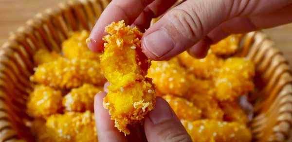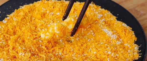 7、炸至表面呈金黄色略蓬松,捞出沥干油。