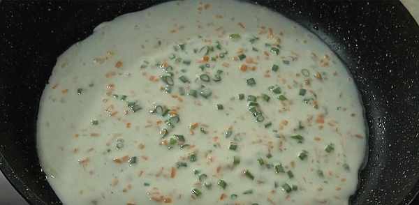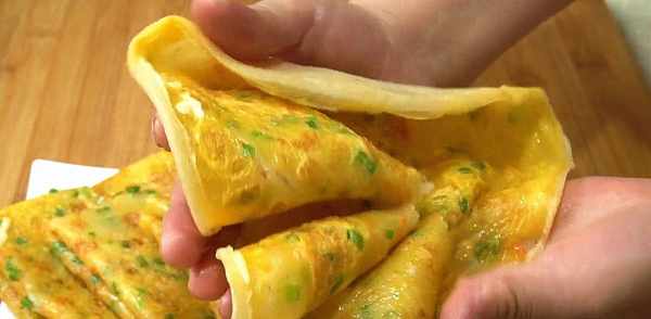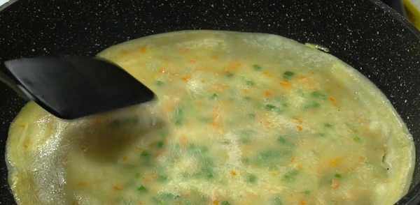 8、待蛋液稍微凝固后,翻面继续用中火煮。不要忘记使用不粘锅,否则不会煮得很好。