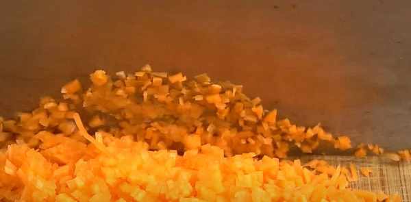 4、胡萝卜切成小方块备用。您也可以使用其他蔬菜,添加任何您想要的。