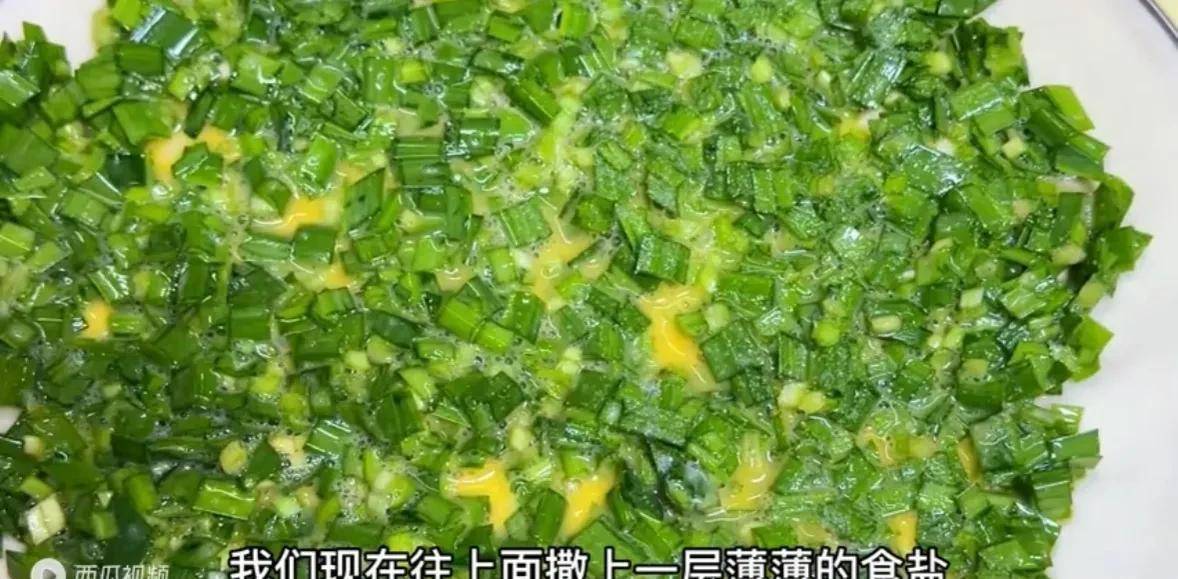 包好后撒上一层薄薄的食盐,把盐分均匀。拌韭菜的时候不要加盐,这样会使韭菜出锅。然后在韭菜上撒上盐。从脱水。水出来了就不咸了。