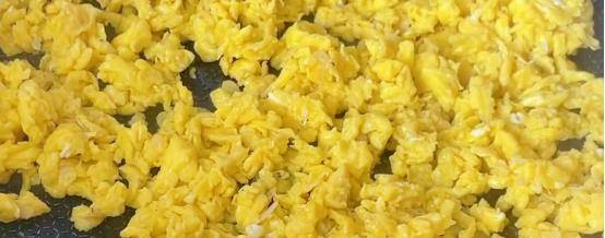 碗中打入四个鸡蛋,加入一小把虾皮和一勺盐拌匀。热锅倒入冷油,倒入蛋液,将鸡蛋煎成块,放凉待用。