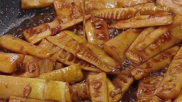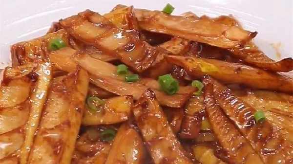 5.将材料放入锅中炖至香,待汁收干即可关火。出锅后,我们撒上准备好的葱花,这样一根香喷喷的油笋就做好了,特别脆,特别软。