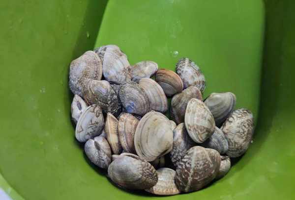 1、将买来的文蛤放入盆中,用清水冲洗干净。洗贝壳时,最好用手洗贝壳表面,最好洗干净。清洗贝壳表面备用;