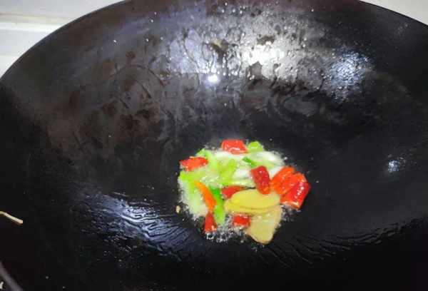 2.小葱、辣椒粉、姜用水冲洗干净。生姜的缝隙上有脏东西,一定要洗干净,把吐出来的生姜捞出来放在案板上用刀切。洋葱和辣椒也要切成小块备用;3.锅内倒入油,放入姜片、小葱和干辣椒。将这些材料放入锅中后,用小火混合,因为它们在烘烤时容易燃烧;