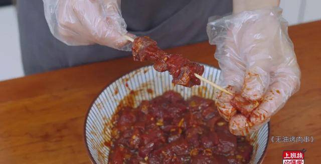 选用脂肪少的梅花肉,腌制好的肉直接进烤箱,不用刷油,这样的烤串多吃几串也不会有负担~