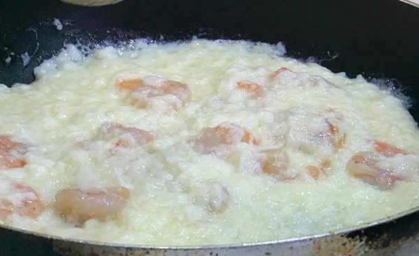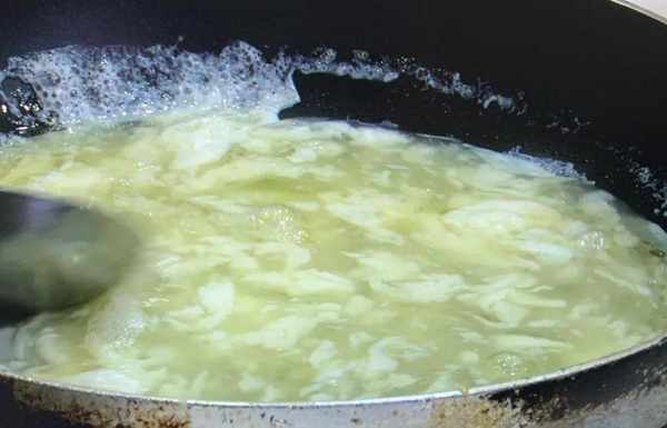 点火起锅,炒这个菜锅里一定要干净,热锅凉油倒进去,把蛋清上的浮沫去掉。慢慢搅,火要小一点,炒出来非常嫩。炒制还没有全熟的时候就把虾仁放进去,和着蛋清一起炒,都裹住虾仁。