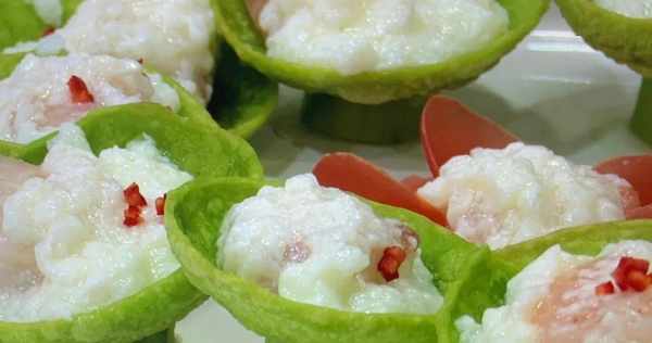 有蛋清的软嫩又有虾仁的滑爽在,老少皆宜。这道菜并不是很复杂,关键是火候的掌握,出锅的蛋清白如雪,裹在虾仁外边,看着格外清新素雅,再装入安大厨特制的盛器中,一个一个宛如阳光下的小莲蓬清新脱俗。