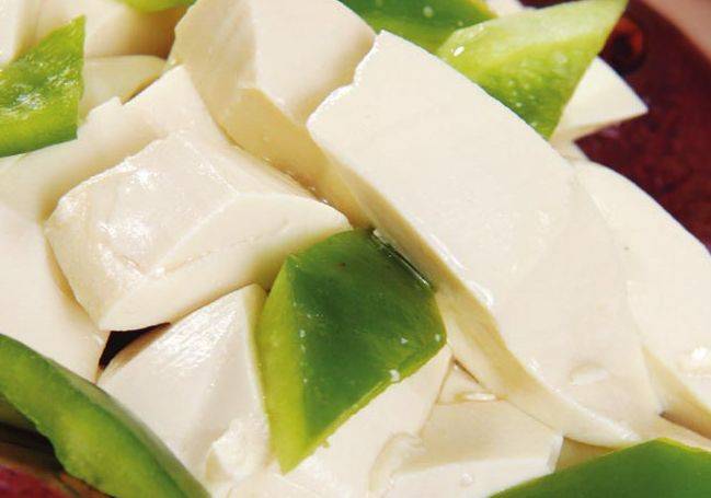 材料:豆腐200克,青椒100克,精盐、白糖各1/2小匙,味精少许,香油1小匙。