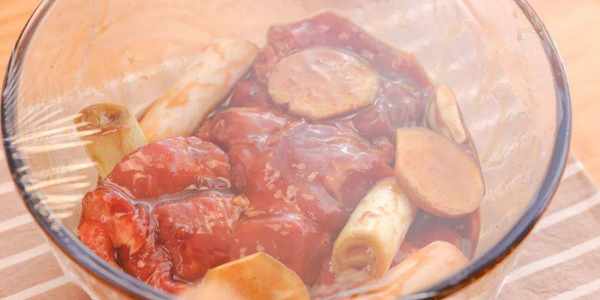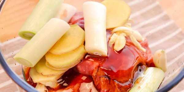 :大葱/一根(切成小段)、生姜片/8片、蒜头/4瓣(拍扁)、叉烧酱/3勺(约30g)、生抽/2勺(约10g)、老抽/1勺(约5g)、料酒/1勺(约5g)、蜂蜜/2勺(约20g)、盐/1勺(约3g)
