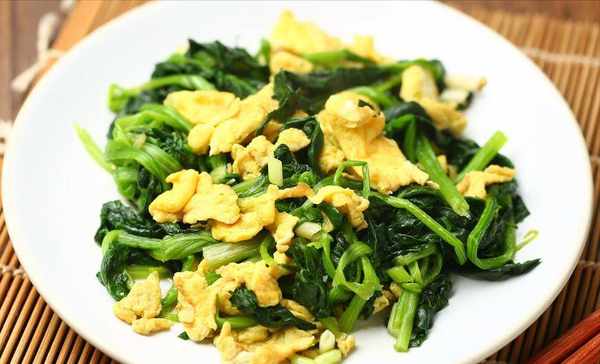 菠菜洗净切段,鸡蛋搅散在碗中,起锅烧水,用开水来给菠菜焯水,去除草酸。锅内倒油,烧热后下入蛋液,炒熟盛出来,然后再下入菠菜,翻炒几下后,炒到断生,重新和鸡蛋混合,用盐和鲜鸡汁调味,出锅。