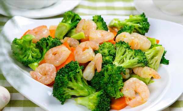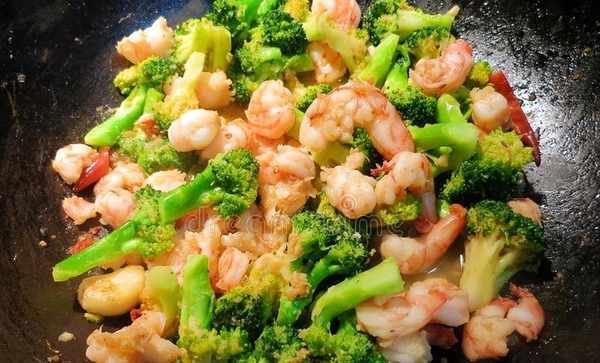 2、起锅烧油,爆香蒜末后,加上虾仁炒到变色,然后倒入蒜末炒香,接下来倒上西兰花、胡萝卜,进行翻炒,炒匀来调味。1勺蚝油、2勺生抽、少许清水,焖煮一下,最后淋入少许水淀粉,待汤汁黏稠后,关火出锅。