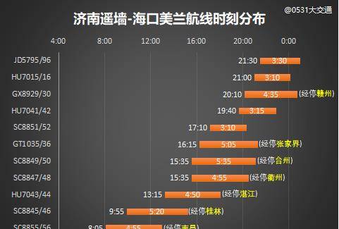 来看一下航班时刻分布,济南-海口的航班时刻分布还是非常不错的,除早班航线略少且全部为经停航线外,没有什么大问题,晚班航线基本达到