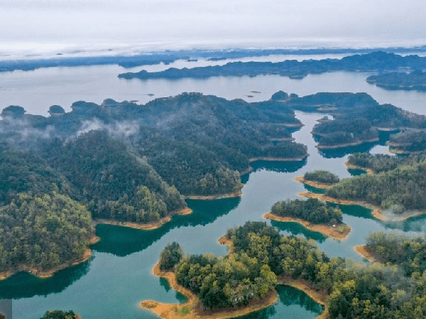 千岛湖波光涟漪,四周群山连绵,林木繁茂,大小岛屿形态各异。
