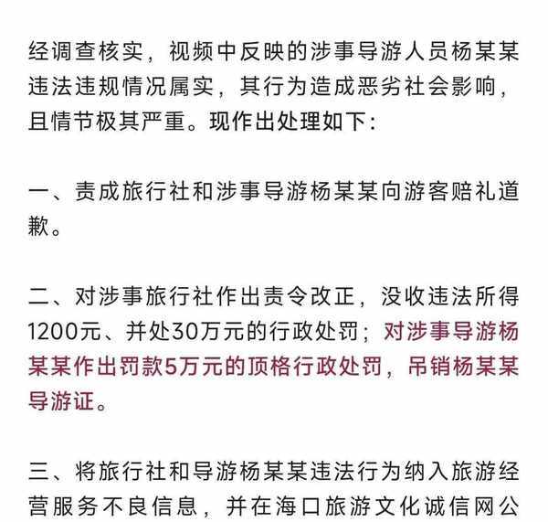 后来经过查实,海口旅游文化公司表示对该旅游团处以30万元的处罚,吊销证明女子的导游并没收这名女子所得的1200元。这下导游火了,这家旅游团也跟着火了。