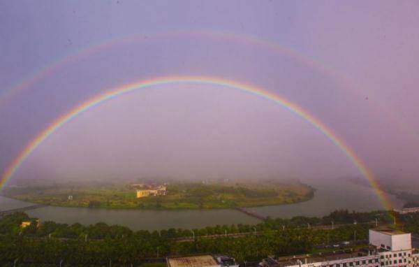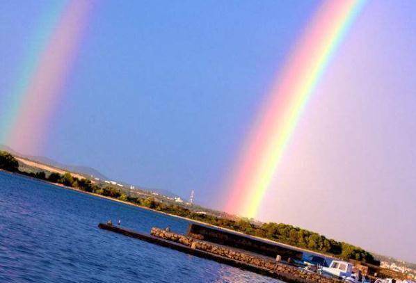 双彩虹是水滴经过两次反射形成的特殊现象。在原本的彩虹之外,出现了一道直径稍大、颜色倒转的同心圆彩虹。内虹又称主虹,外红内蓝,颜色鲜艳。外面的彩虹被称为次级彩虹。外面的彩虹是蓝色的,里面的彩虹是红色的。它是黑色的,看起来像一条发带。研究表明,初级彩虹是由水中的反射引起的,而次级彩虹是由两次反射引起的。