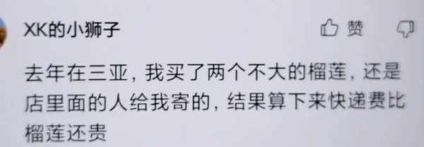 去年去三亚,买了两个不大的榴莲,还是店里面的人给我寄的,结果算下来快递费比榴莲还贵!