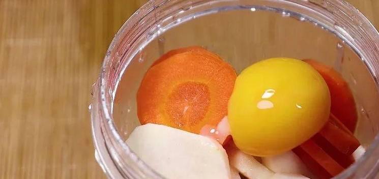 往料理杯中加入山药片、胡萝卜片以及蛋黄,拧紧料理杯搅打2分钟。