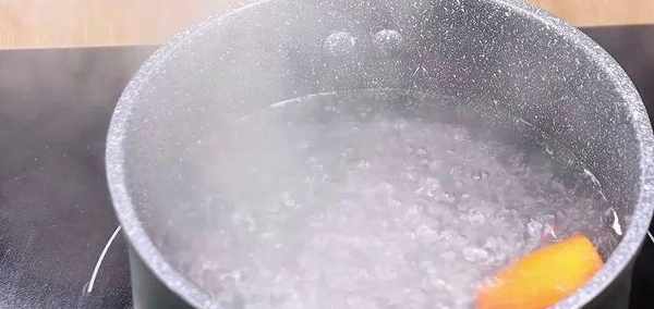 奶锅烧水,水开放入胡萝卜,焯水2分钟,捞起。