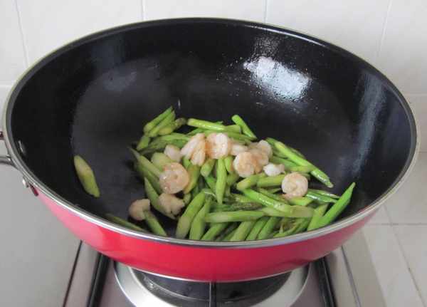 4、另起锅,芦笋倒入,翻炒
