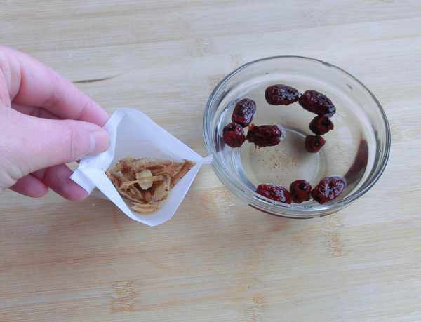 做法:1. 当归、黄芪洗净放入茶包中,红枣泡开。
