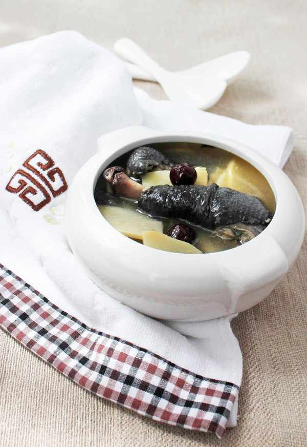 材料:乌骨鸡半只,春笋100克,当归5克,黄芪5克,红枣8个。
