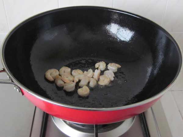 3、炒锅中放油,下虾仁滑炒,盛出