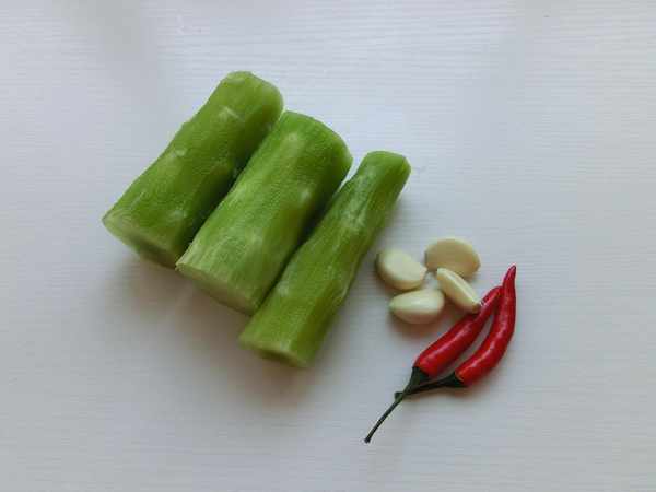 食材:莴笋300克,红辣椒2个,蒜4瓣。