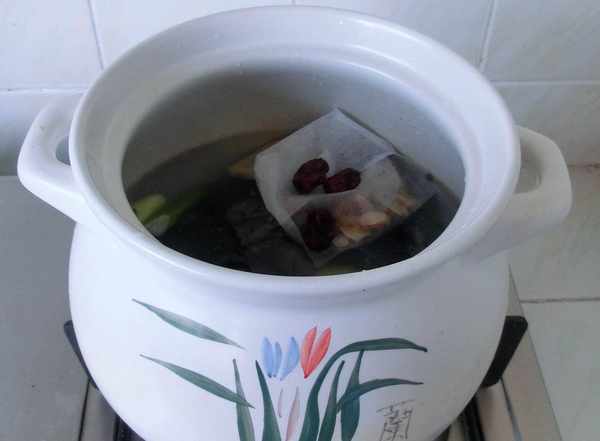 5.再放入红枣和茶包,大火煮开,转小火煲1小时左右。