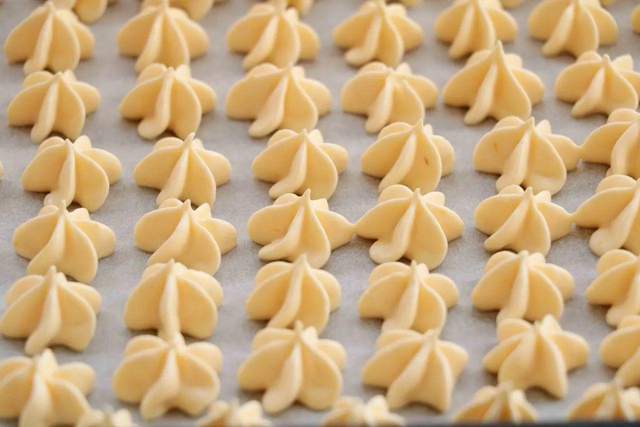 10、挤出成型并放在烤盘上,每个之间留出一定的间隔。