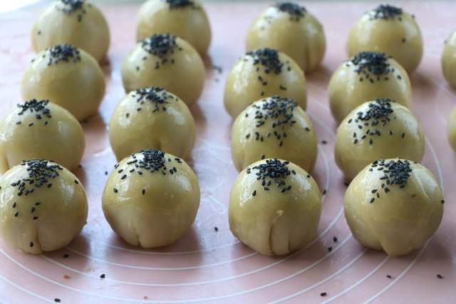 10、将面块摆放在烤盘上,刷上一层20克的鸡蛋液,再撒上适量的黑芝麻。预热烤箱,烤箱温度设为160度,上下火烤约25分钟即可。