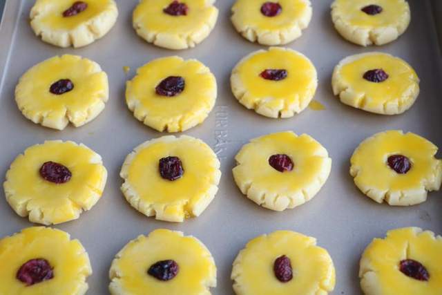 4、用刷子刷上一层蛋液,再放上一些蔓越莓干,稍微按压一下,让蔓越莓干附着在饼干表面。
