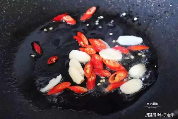 3、倒出锅内多余的水,重新加入少许的食用油,等待油热后,放入辣椒、蒜米爆炒香味。