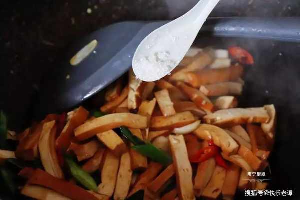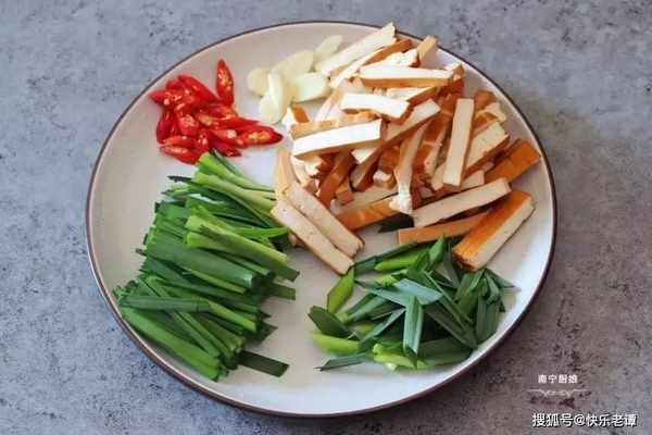 主要食材:一把韭菜段,6片香干,4颗小米辣,3粒蒜米,一小段蒜苗。