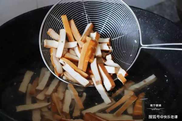 2、找出干净的锅,倒入能没过香干的清水,香干直接冷水下锅,等到水开始沸腾,稍微搅动香干几秒钟后,就能出锅放在一旁等待下一步。