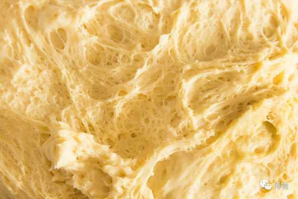 然后就是必不可少的酵母,它会将面粉中的糖分转化成酒精和二氧化碳,让气体分散着充满面团内部,改变面筋分子链的“条理”,让面筋分子链的方向尽量一致。但酵母产生二氧化碳的速度较慢,充分发酵需要1小时左右。