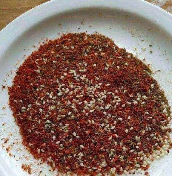第二步、盘中放辣椒面、孜然粉、芝麻搅拌匀称
