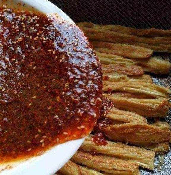 备料:腐竹、辣椒面、孜然粉、白芝麻、盐、鸡精、芝麻酱