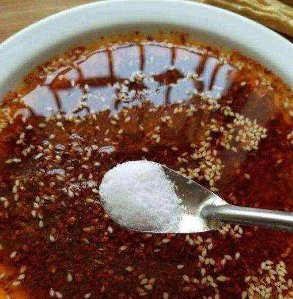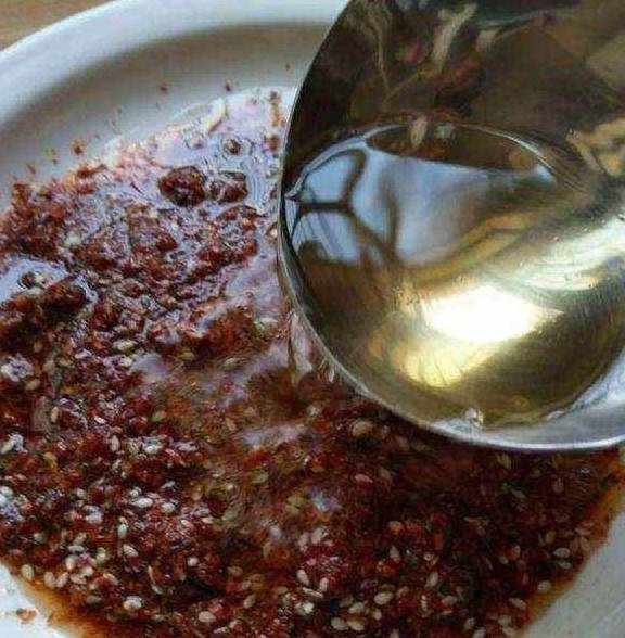第三步、然后倒入半勺油到拌好的面中,再到锅中烧半勺油,油热后浇到辣椒面中拌匀称