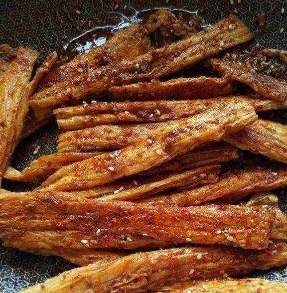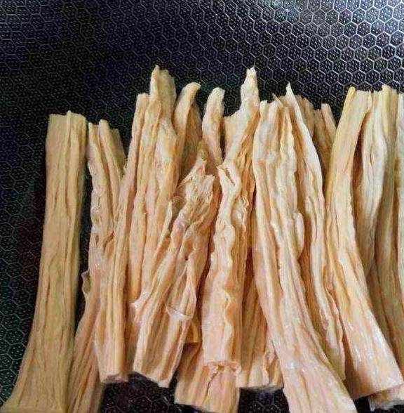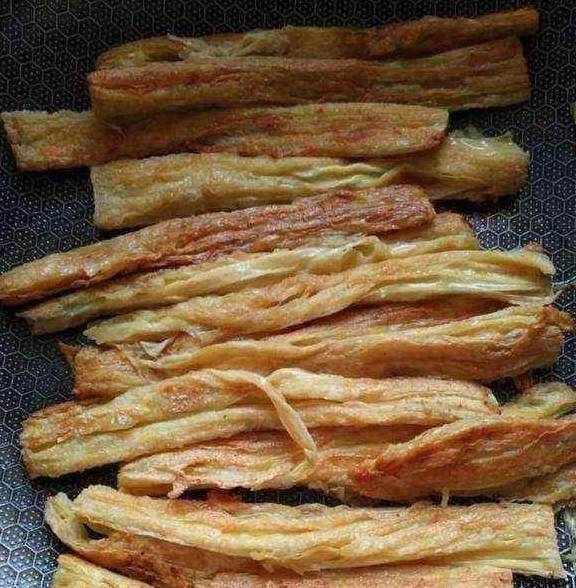 第五步、泡好的腐竹洗干净捞出控水,锅中插手油烧热,把腐竹下入锅中煎,小火慢煎,煎至水分干,两面都有点变金黄