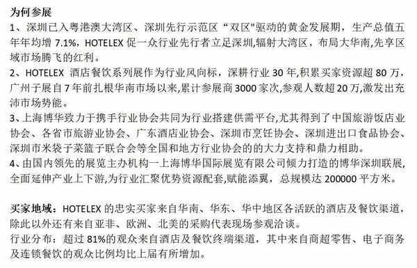 多重赋能之下,HOTELEX 深圳展必将以高端品质、专业服务推进华南地区的酒店餐饮行业向蓬勃发展,带领华南酒店餐饮服务业升级新风向。2023年12月14-16日,深圳国际会展中心(宝安新馆)