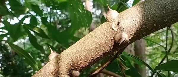 首先我们可以看一下这棵植物的枝干上非常多大大的疙瘩,而且疙瘩当中还带有倒刺,一不小心很容易把手刮伤。这种植物它全身上下都是宝,不管是根茎、叶子、果实都具有非常高的药用价值,也具有非常高的食用价值,可以说是药食同源的一种植物。