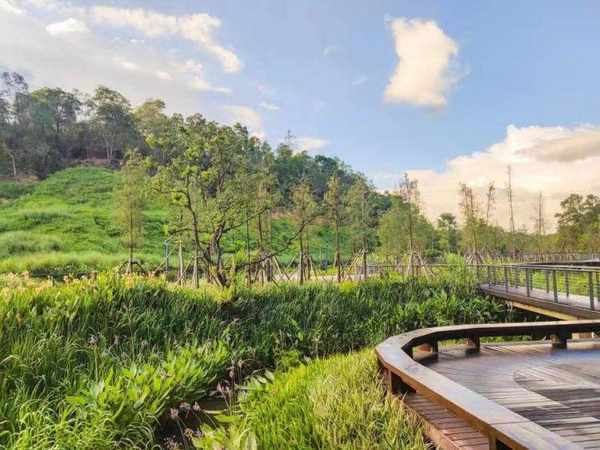 大沙河公园是大沙河碧道的特色景观节点之一,园区内设置三生广场、放飞广场、三生亭、风铃径等重要景点,碧道周边设置了一系列人性化便民休闲设施,如健身设施、人行步道、儿童游乐区、休息座椅等,方便市民前往游玩。