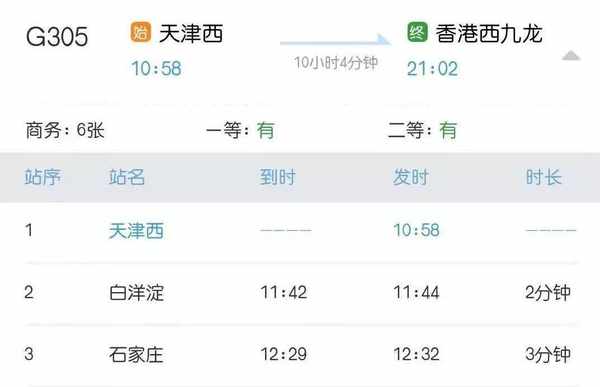 天津开往香港的高铁