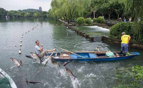 西湖上演飞鱼奇观,鱼跃龙门兆头吉祥吸引众人拍照许愿沾喜气