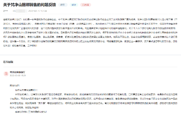 而在2022年3月9日时,贵州省文化和旅游厅就投诉内容予以回复,表示已对景区运营企业明确要求:确是旅行社定制团或小包团的,可提前向景区报备并申请购票,对于有国家导游证的正规导游带团进景区,给予相应的优惠政策,鼓励导游做好旅游服务;禁止对中南门历史文化旅游区的产品组合作硬性规定;如发现销售“黄牛票”等违法违规行为,将积极主动联合有关部门坚决依法打击。