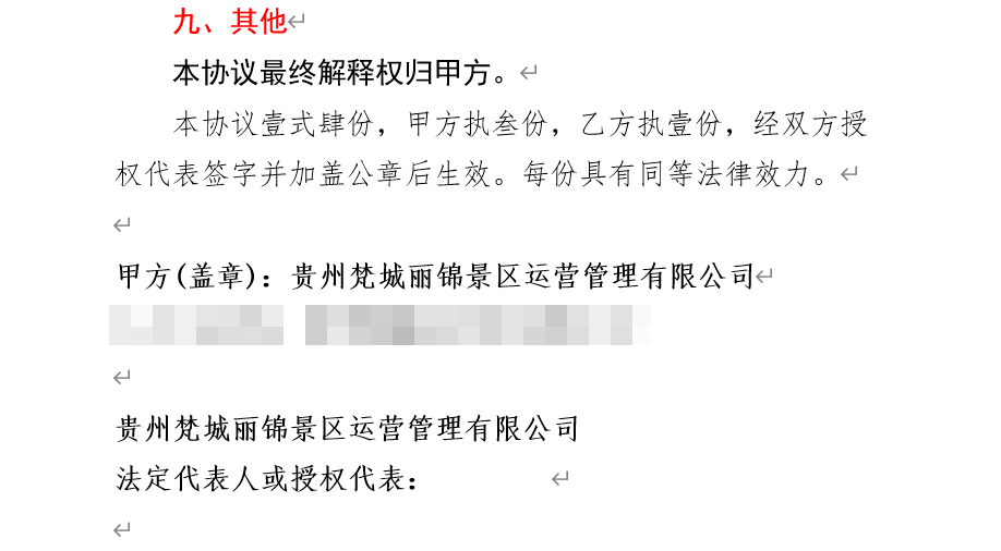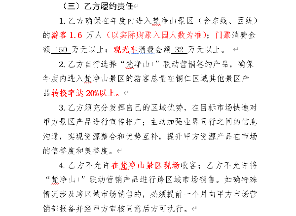不仅如此,协议中还提到乙方签约梵净山景区为主要行程的1日游产品,不享受任何形式的门票配套优惠政策,乙方落地产品同时含2、3日游产品的,累计人数完成任务的,按比重大的行程产品予以对应政策配票。