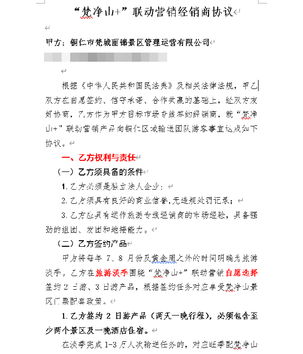 根据闻旅拿到的“梵净山+”联动营销经销商协议文件,可以看到甲方为铜仁市梵城丽锦景区管理运营有限公司,乙方为旅行社企业,要求签署协议的乙方必须是独立法人企业,具有良好的商业信誉,无违规处罚记录,具有运作旅游专线经销商的市场经验,具备强劲的组团、发团和地接能力。