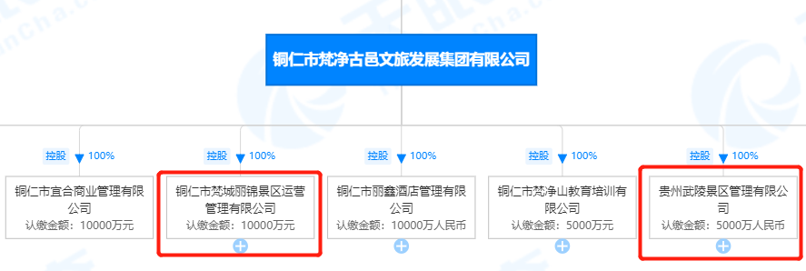而此次“梵净山+”联动营销经销商协议的甲方铜仁市梵城丽锦景区运营管理有限公司与贵州武陵景区管理有限公司存在紧密关系,经天眼查查询发现,该公司同样也由铜仁市梵净古邑文旅发展集团有限公司100%控股,是其全资子公司。