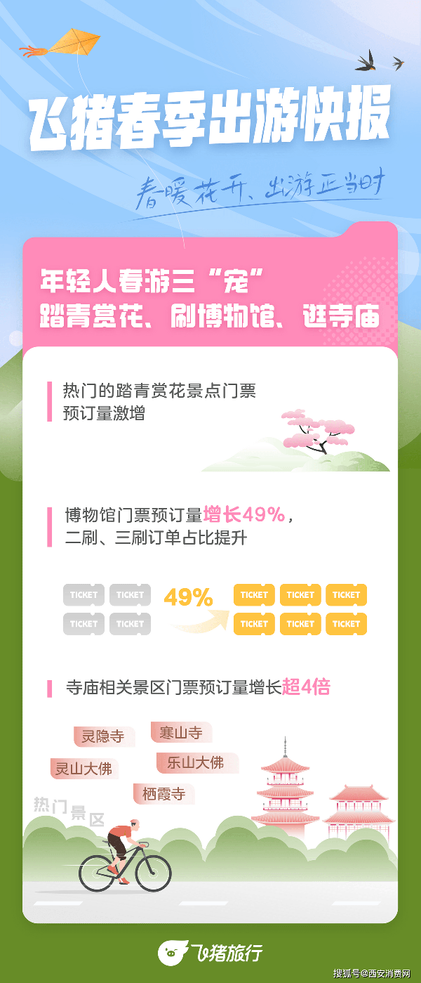 博物馆、寺庙等传统景点如今也是年轻人眼中的“香饽饽”。飞猪数据显示,近一个月博物馆门票预订量同比增长49%,其中“二刷”甚至“三刷”的订单占比也在提升,“看展式研学”“看展式社交”已成为90后、00后的生活方式。值得一提的是,寺庙打卡的热度也在持续走高。飞猪数据显示,近一个月寺庙相关景区门票预订量同比增长超4倍,其中灵隐寺、寒山寺、灵山大佛、栖霞寺、乐山大佛等是热门景点。